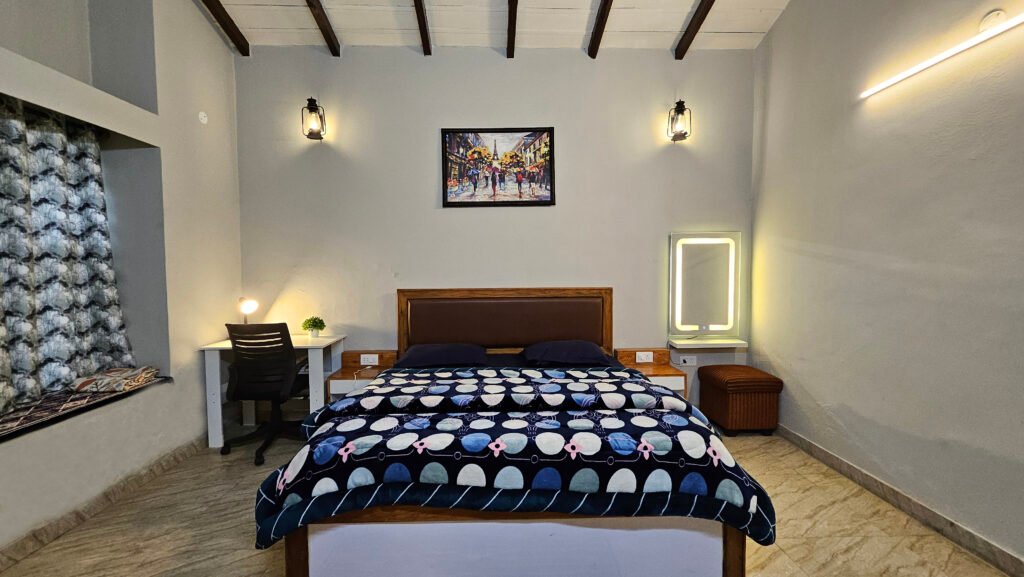 KITCHEN: Prepare delicious meals in the fully equipped kitchen, complete with modern amenities such as a microwave, fridge, toaster, LPG burners, and utensils. Guests can also order food from our curated food menu, offering a selection of home-cooked dishes prepared with love and care.