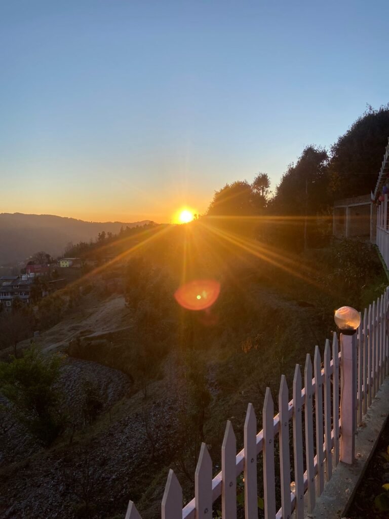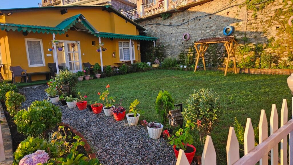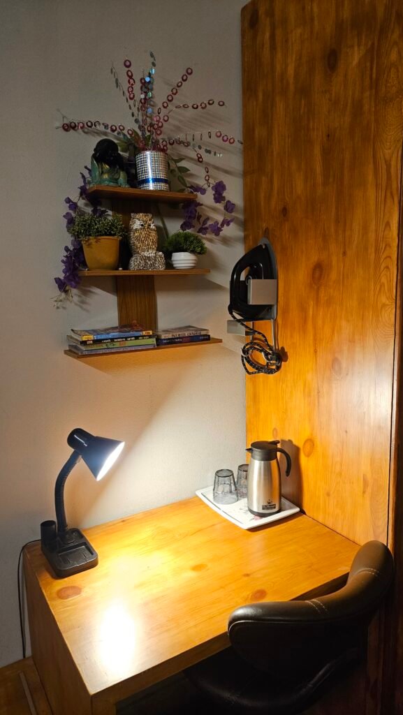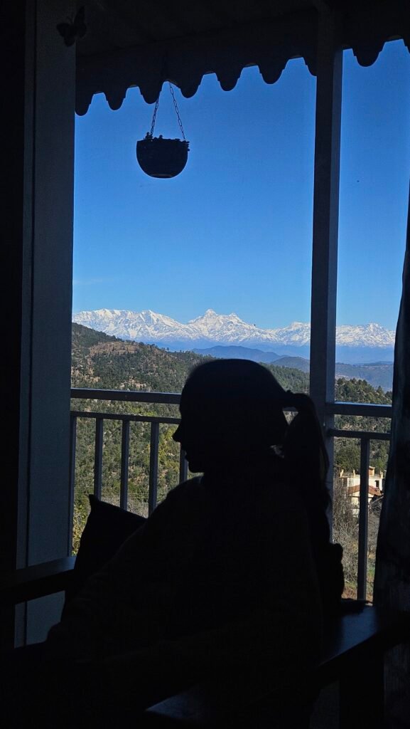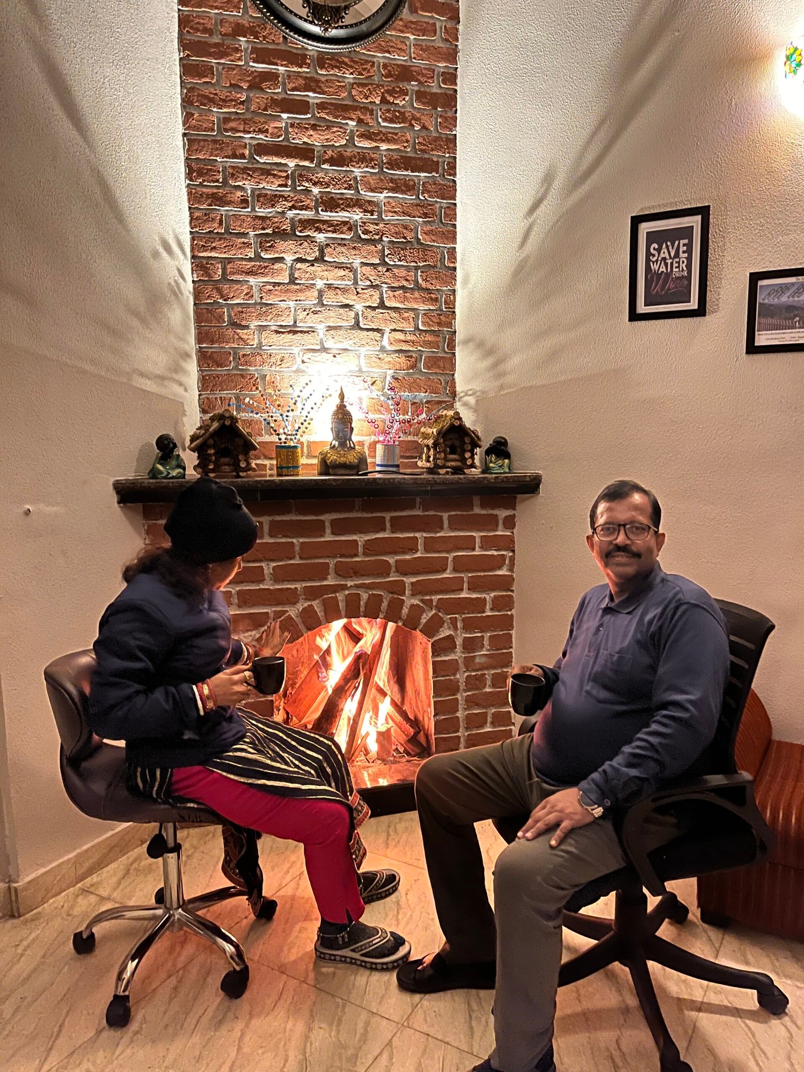 LIVING ROOM: With a private, expansive living room, this unit offers ample space for relaxation and gatherings. The spacious living room features a comfortable sofa, an indoor fireplace for cozy ambiance, a 55″ smart TV for entertainment, and a large window that frames stunning Himalayan views, creating a harmonious blend of comfort and natural beauty.